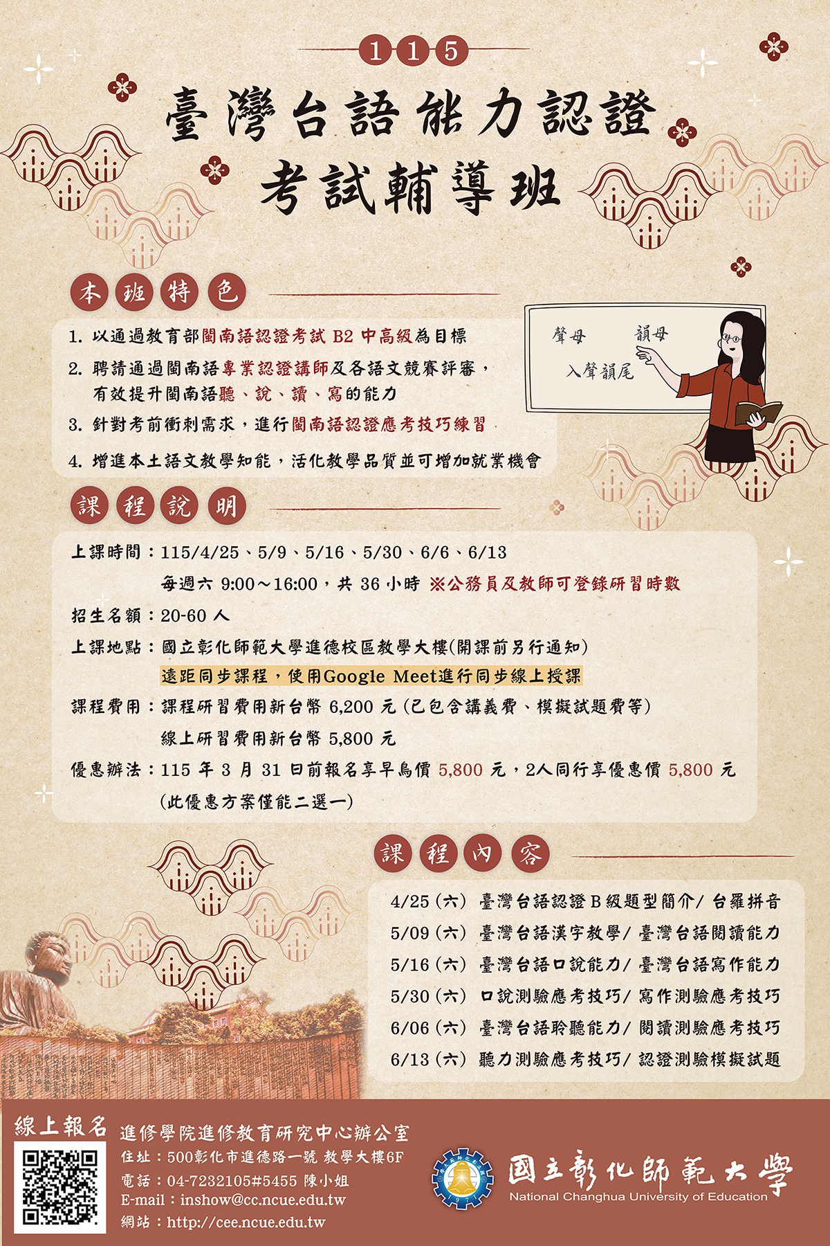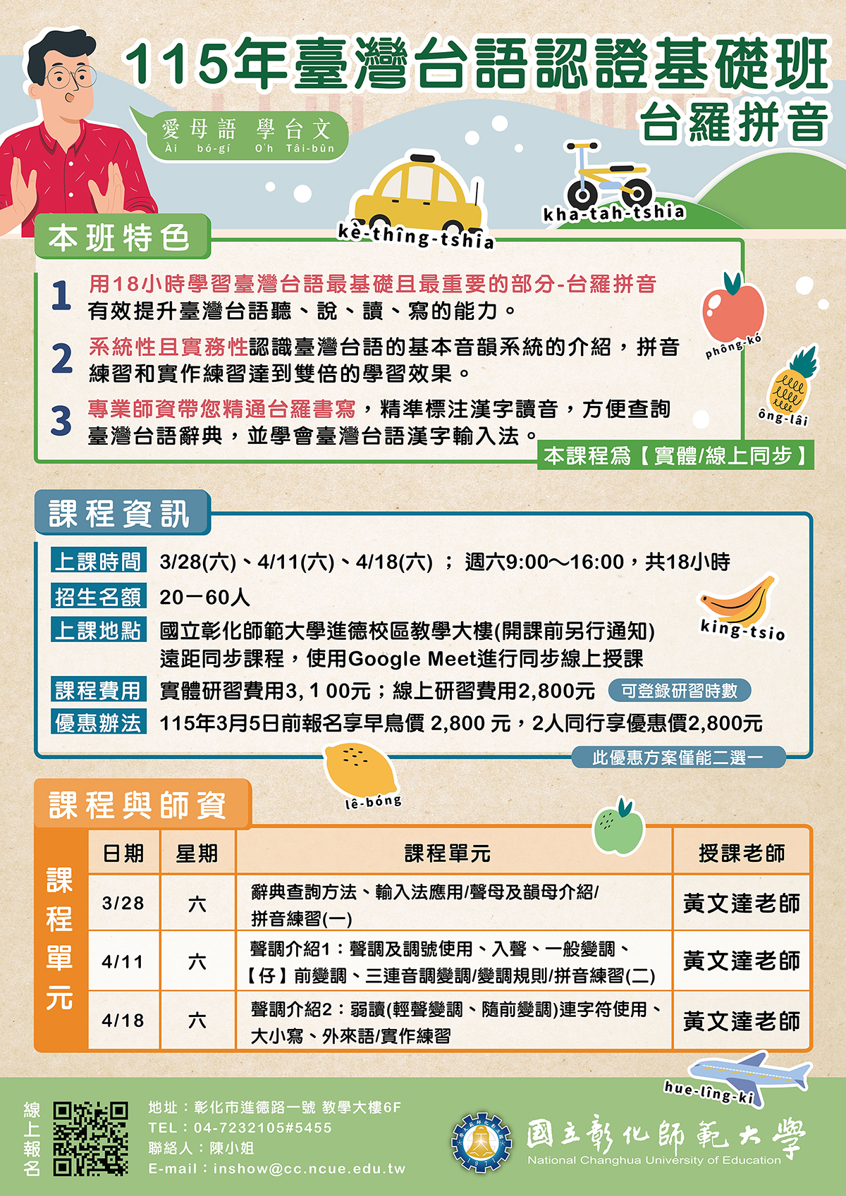 轉知國立彰化師範大學進修學院推廣教育課程「115年臺灣台語認證基礎班-台羅拼音」、「115年臺灣台語能力認證考試輔導班」課程簡章。