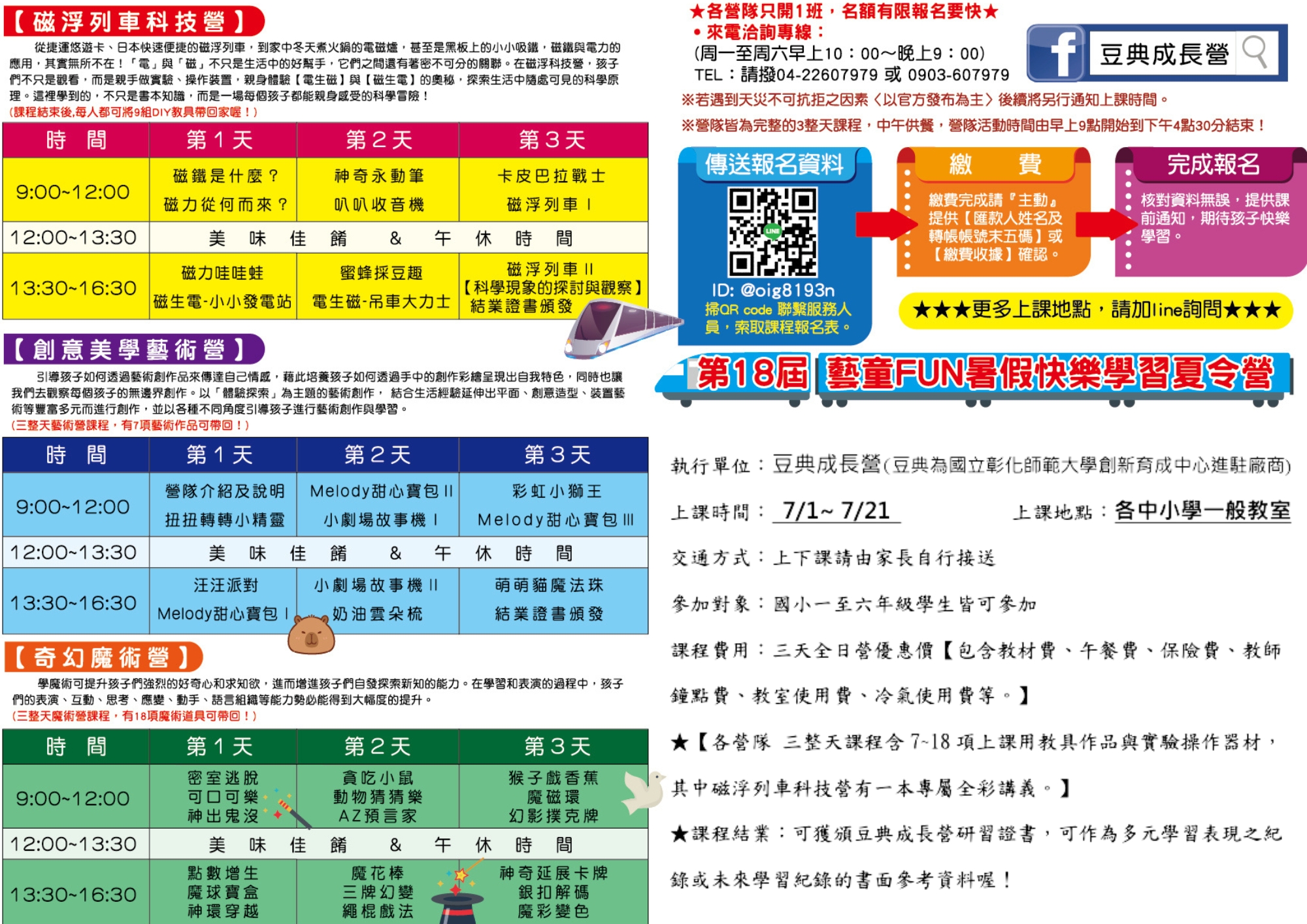 | 一、 | 旨揭暑期活動分為磁浮列車科技營、創意美學藝術營、奇幻魔術營三項,歡迎貴校學生踴躍報名參加。 |