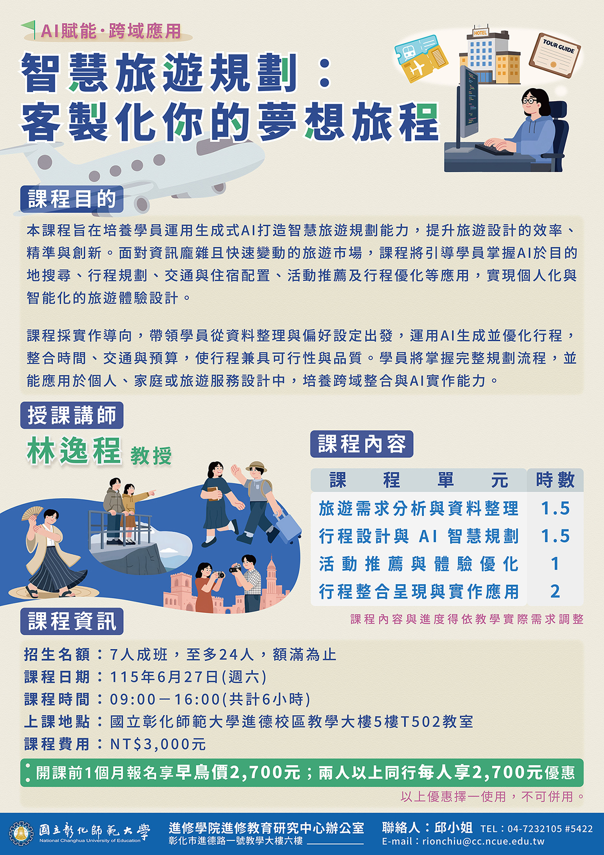 轉知國立彰化師範大學進修學院推廣教育課程「【AI賦能.跨域應用】 學術研究與論文寫作:從文獻回顧到論文潤飾」、「【AI賦能.跨域應用】 智慧旅遊規劃:客製化你的夢想旅程」、「【AI賦能.跨域應用】 行政與職場生產力:打造你的數位秘書」課程簡章。