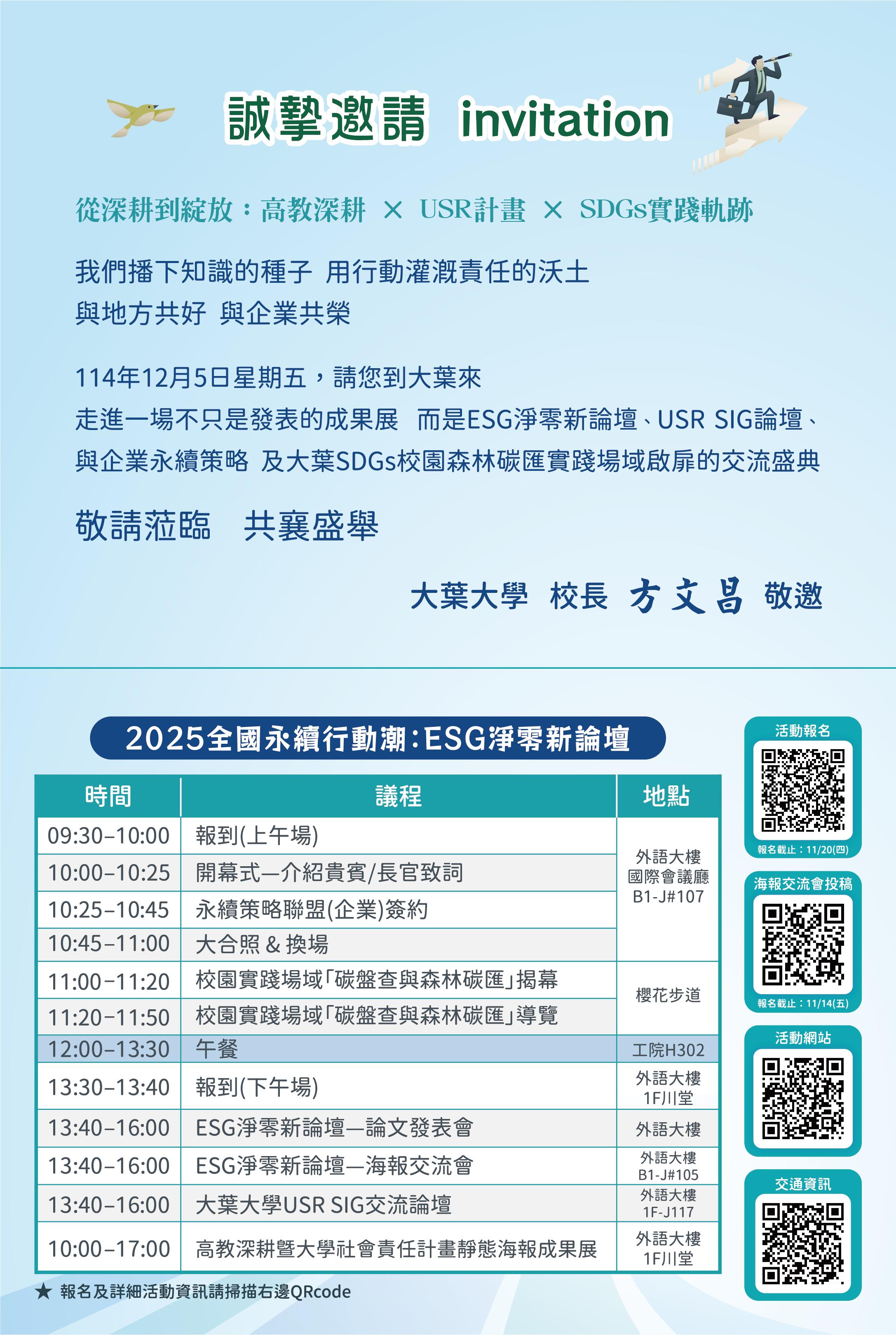二、為展現該校114年高教深耕暨USR計畫豐碩成果,並回應聯合國永續發展目標(SDGs)及全球淨零排放行動,透過第三座校園實踐場域揭幕、ESG淨零新論壇(論文和海報)徵稿、USR交流論壇及靜態海報成果展等,將各項特色成果亮點以多元方式呈現,共同分享成果與經驗交流。