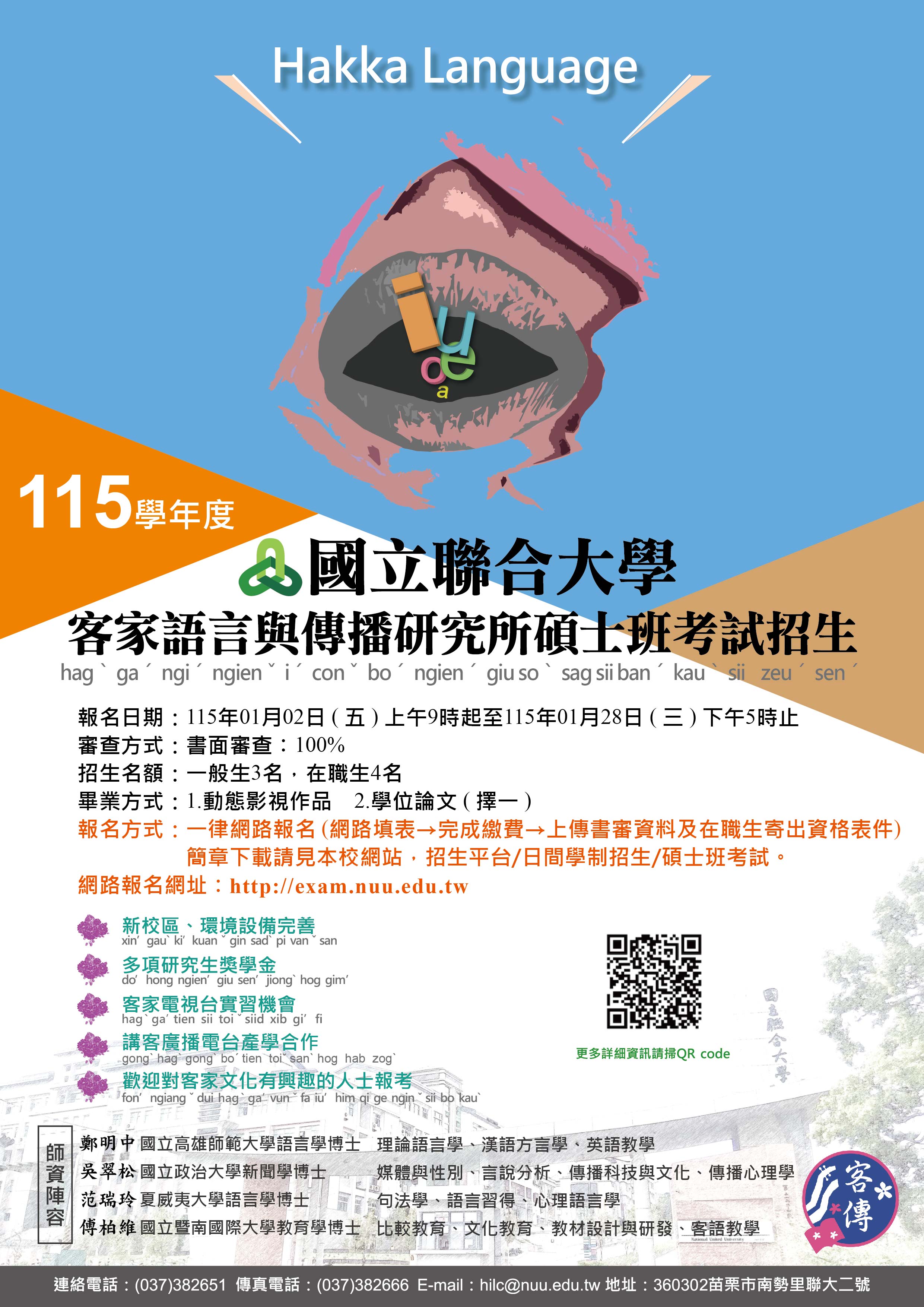 二、該校客家語言與傳播研究所115學年度碩士班考試招生,報名日期自115年1月2日(五)上午9時起至115年1月28日(三)下午5時止。